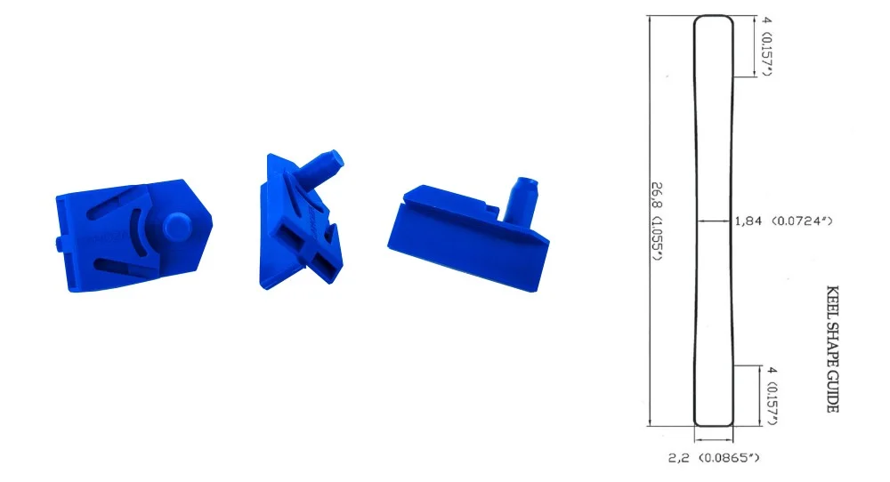 Original Text: LONG CUT DOWN NYLON ELASTIC GUIDE long cut down guide for integral guide tongue chassis, lenght 26.8 mm, special shape of keel (see picture), content: blue nylon, glass fibre, these guides have minimum content of glass fibre for higher elasticity, very precise, high quality material used