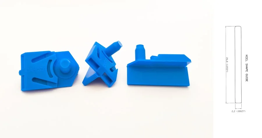 Original Text: LONG CUT DOWN NYLON ELASTIC GUIDE upgraded version of long cut down guide (#335) for integral guide tongue chassis, lenght 26.8 mm, straight keel (see picture), content: blue nylon, glass fibre, these guides have minimum content of glass fibre for higher elasticity, very precise, high quality material used