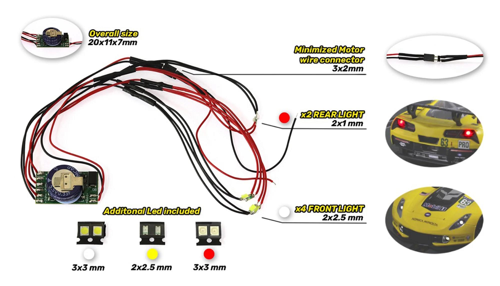 Kompakte Abmessungen: 20 x 11 x 7 mm Ausstattung: 4 Frontlichter und 2 Rücklichter