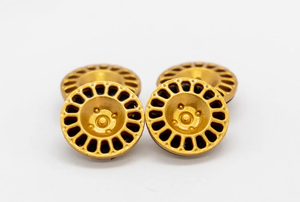 Felgeneinsätze goldv f. Slotcars 1:24 BRM GR2 - BMW 2002, Datsun 240Z, Ford Capri + Escort, Opel Kadett, Porsche 911, VW Scirocco, Alfa Romeo - Giulia