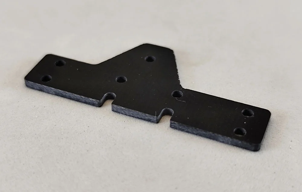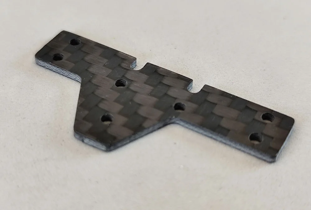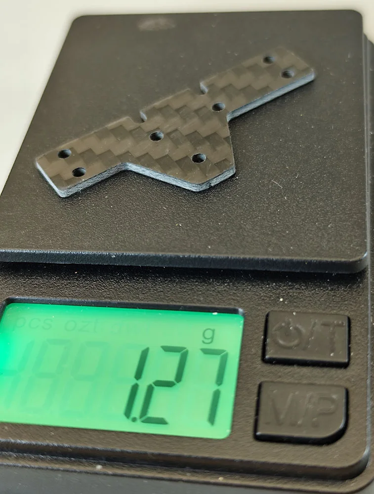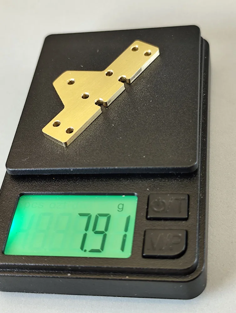 Durch die Verwendung von T-Aluhülsen oder die Anpassung der Schraubenlängen kann das Gewicht des Chassis individuell reguliert werden. Zusätzlich bieten die vorgesehenen Aussparungen im Chassis Platz für weiteres Gewicht, das mit Messing (1,5 mm oder 2 mm), GFK oder CFK ergänzt werden kann. Die Wahl des Materials wirkt sich dabei maßgeblich auf die Gewichtsanpassung aus.