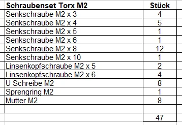 Senkschraube M2 x 3 4 Senkschraube M2 x 4 5 Senkschraube M2 x 5 1 Senkschraube M2 x 6 1 Senkschraube M2 x 8 12 Senkschraube M2 x 10 1 Linsenkopfschraube M2 x 5 2 Linsenkopfschraube M2 x 6 4 U Schreibe M2 8 Sprengring M2 1 Mutter M2 8
