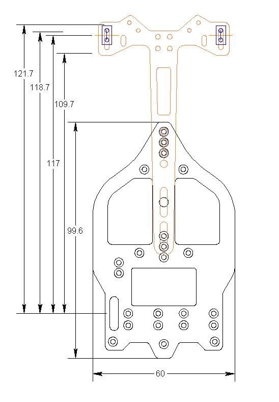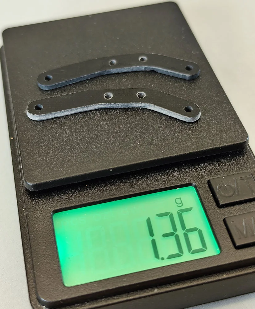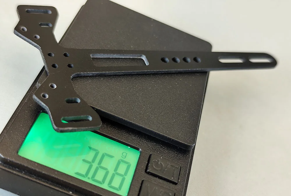 Durch die Verwendung von T-Aluhülsen oder die Anpassung der Schraubenlängen kann das Gewicht des Chassis individuell reguliert werden. Zusätzlich bieten die vorgesehenen Aussparungen im Chassis Platz für weiteres Gewicht, das mit Messing (1,5 mm oder 2 mm), GFK oder CFK ergänzt werden kann. Die Wahl des Materials wirkt sich dabei maßgeblich auf die Gewichtsanpassung aus.
