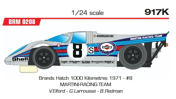 Slotcar 1:24 Analog BRM - Porsche 917K - Brands Hatch 1000 Kilometres 1971 - #8 MARTINI-RACING-TEAM V.Elford - G.Larrousse - B.Redman — Rennversion, Metall-Chassis